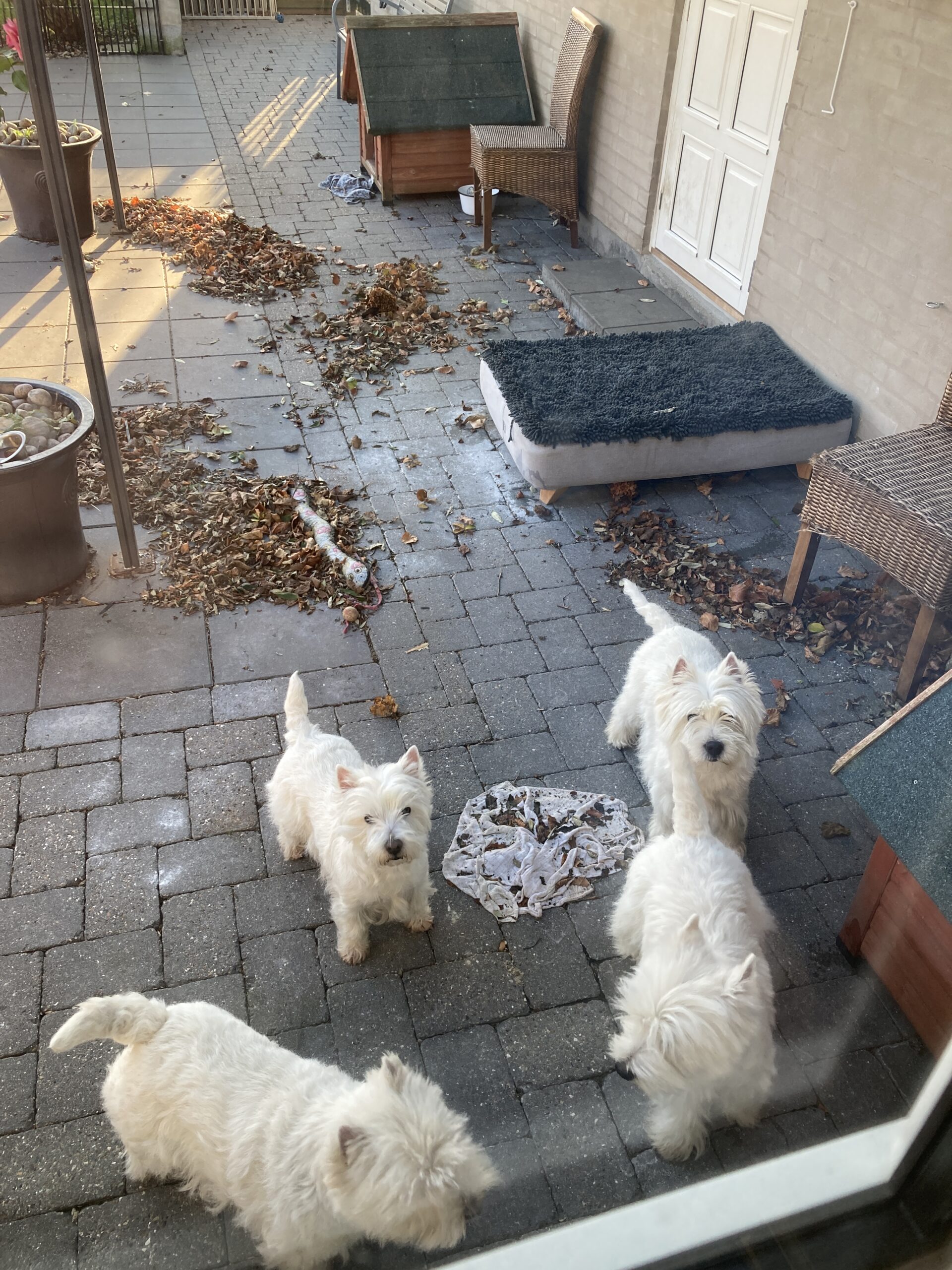 Så skönt för hundarna att få lite paus från trimborden och få leka av sig lite på gården, medan Carina bjöd på kaffe och kaka.