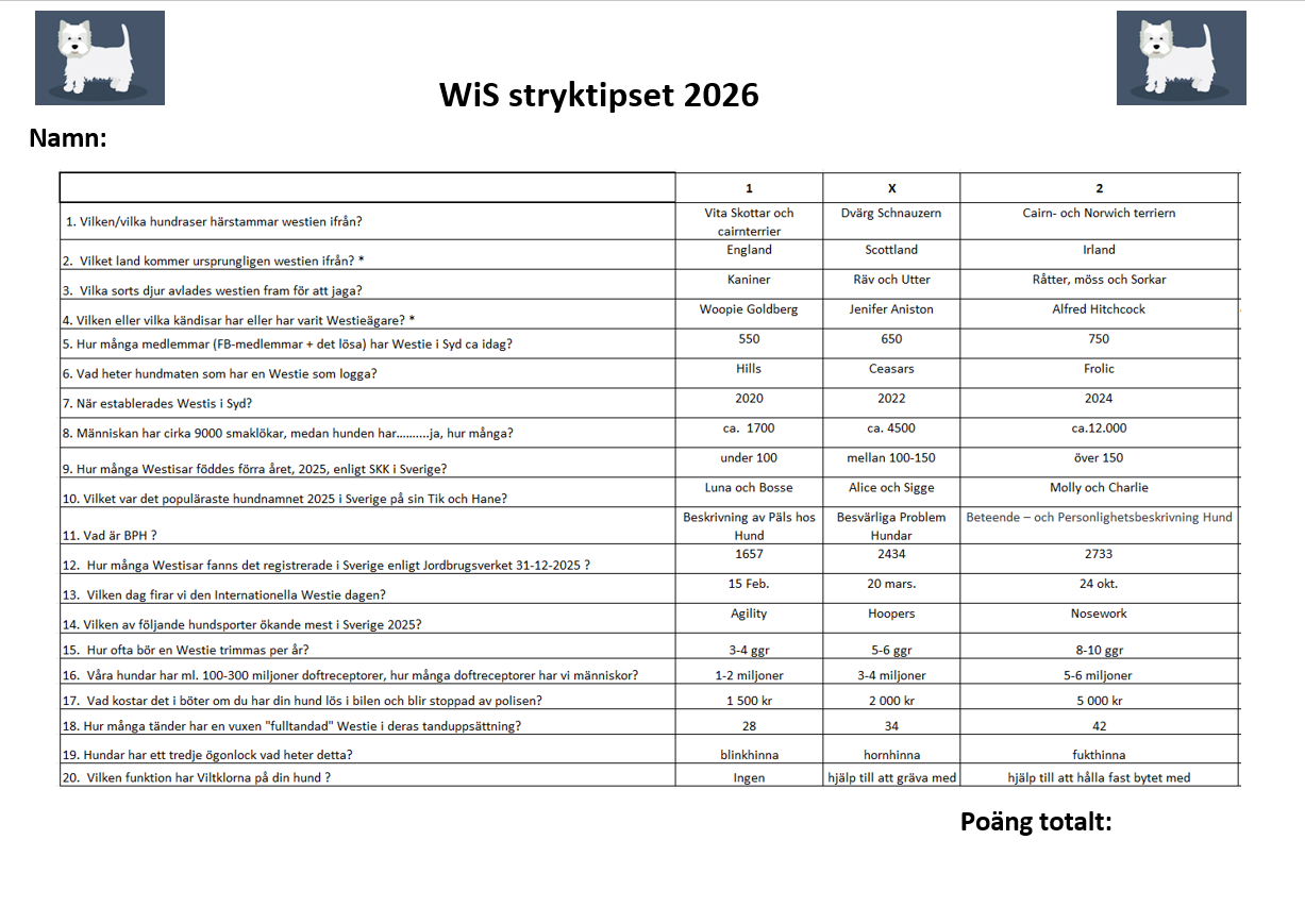 Idag var det westiepromenad i Alnarpsparken, med tipsrunda i solen. Så trevligt! Här kommer frågorna för er som missade promenaden och vill testa era westiekunskaper.