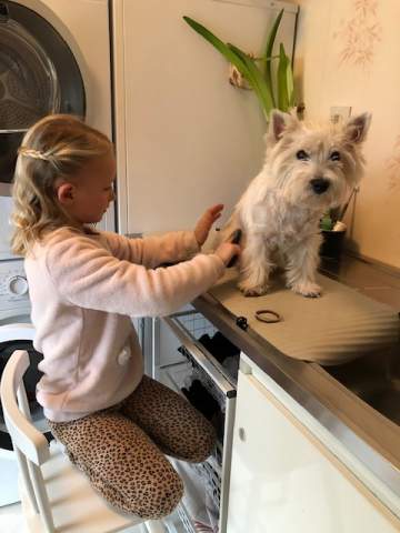 Mellan trimningarna är det viktigt att ni kammar igenom grundligt med borste/karda och stålkammen. Glöm inte frambensvecken och ljumskarna. Försök att ställa upp hunden på något halkfritt underlag så att det är enklare att pyssla med den. Att sköta om sin hund kan bli en mysig stund som stärker banden mellan er.