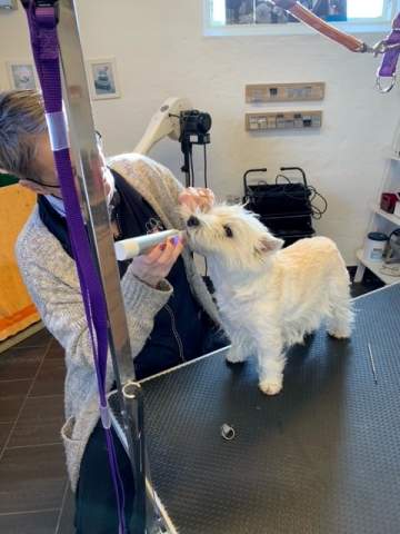 Se till att det gått minst 14 dagar efter bad (var hunden blivit schamponerad) om den skall trimmas.