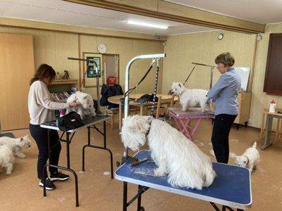 Den 21 april var det dags för Westie i Syds trimträff på Råådalens brukshundsklubb i Helsingborg. Sex tikar och en hane skulle upp på trimborden denna dag. Fint att kunna hjälpa varandra med trimkunskaperna, och roligt att se att vi alla har lärt oss så mycket på kurserna vi gått. Hundarna blev riktigt fina när de var klara. Nu fortsätter vi hemma på egen hand och så träffas vi igen om ett par månader. Håll utkik i kalendern efter nästa trimträff.