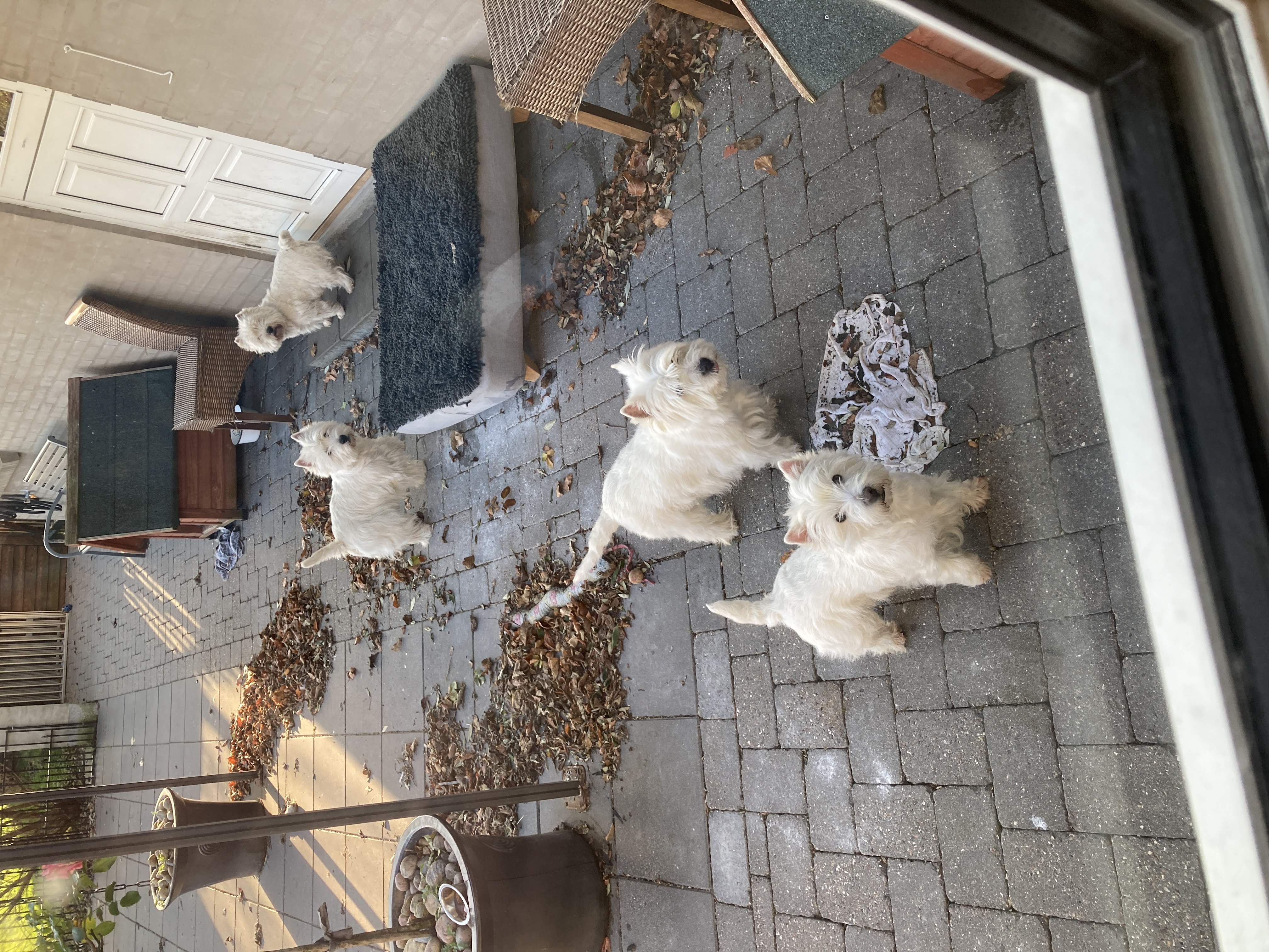 Så skönt för hundarna att få lite paus från trimborden och få leka av sig lite på gården, medan Carina bjöd på kaffe och kaka.